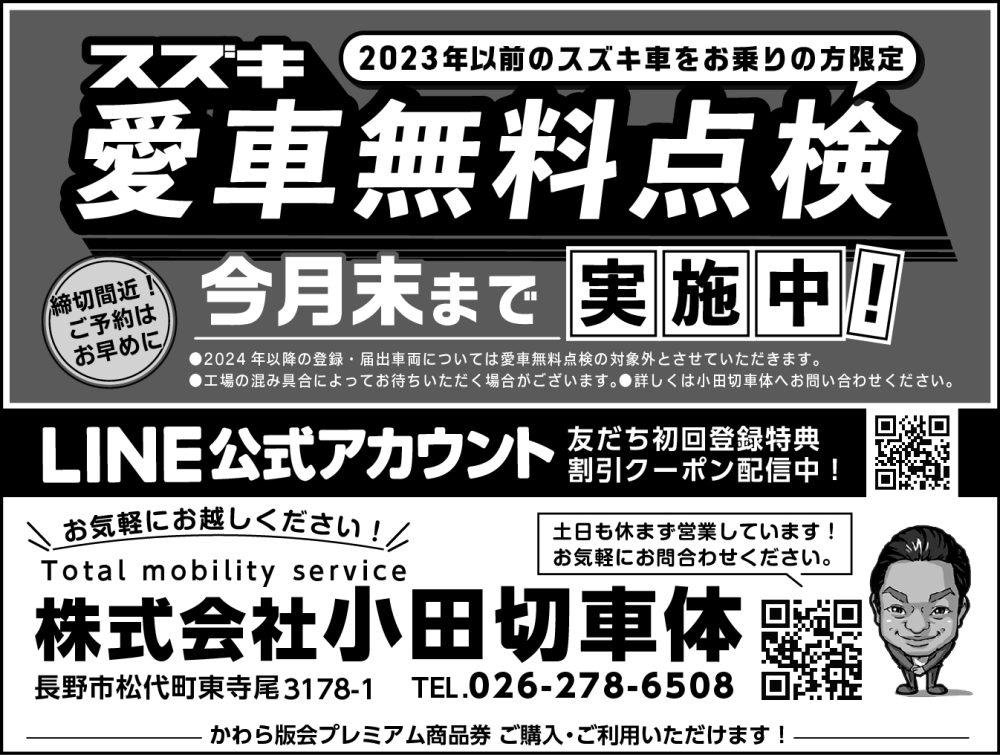 本社・長野中央店にてスズキ愛車無料点検実施中!2023年以前に登録・届出されたスズキのお車を対象にエンジンオイルの状態・エアコンの効き具合等の全15項目を点検します。