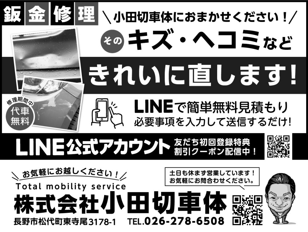 大切なお車のキズ、ヘコみ、突然のパンク。 小田切車体できれいに直しませんか?